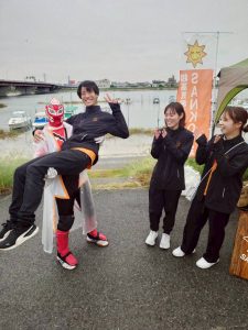 ご当地ヒーローのモモキッドさんにお姫様だっこされる栗本くん(笑)