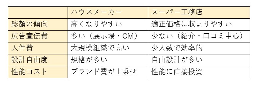スーパー工務店とハウスメーカーでは、同じ性能でも総額に違いが出るケースがあります。