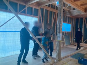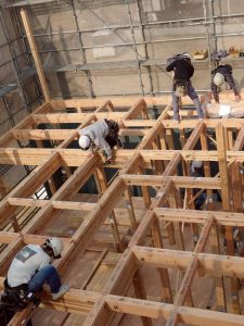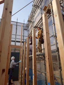 大工さんたちの抜群のチームワークで、柱や梁が次々と組み上がり、