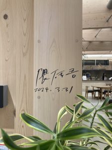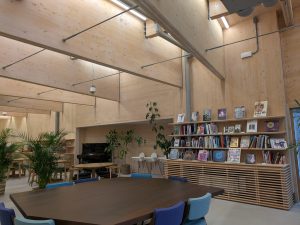 本棚の棚板が斜めに勾配付けてカットされていたり、外観のCLTパネルがバッテンに交差されていたりと、細部にまでデザイン性が感じられ、見ごたえのある建物でした。