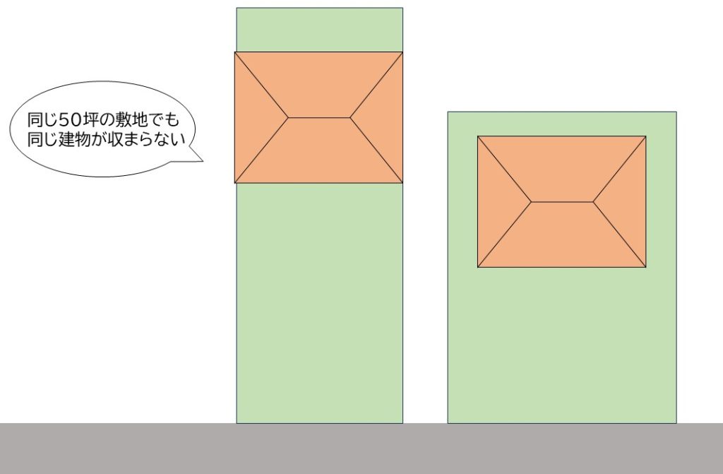 例えば、同じ50坪の敷地でも土地の形や寸法によって、建てられる家のサイズが変わってくることがあります。