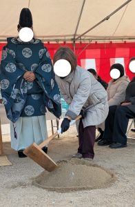式の途中では、お施主様にお塩で建物の四方のお清めや鍬入れなどにもご参加いただきました。