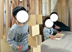 現場にあったフローリングの端材で積み木のように遊んでいました。