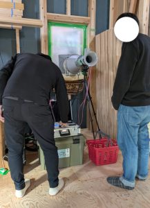 SANKOの家は気密がとても良いので機械で自動で測定するとエラーを出してしまうらしく、手動で測定を行っていきます。