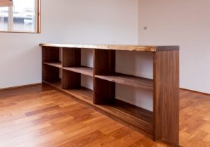 造作の収納棚も、深みのある色合いで統一。