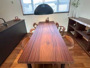 ダイニングテーブルにはサペリの一枚板を採用。