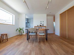 SANKOの家では、化学物質の少ない自然素材を使用しています。壁には漆喰(しっくい)を採用し、調湿・抗菌・防カビ効果を発揮。無垢材の床は有害な接着剤を使わず、木が持つ自然な香りと温かみを感じることができます。