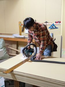 寸法を正確に測り、必要なサイズにカット。手際よくボードを張っていきます。