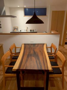 ダイニングテーブルは、お施主様がMUKUten.岡山で直接こだわって選んだモンキーポッドの一枚板テーブル。