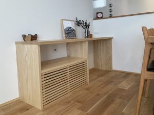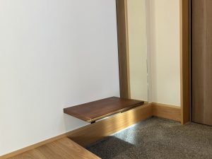 玄関には一枚板のベンチと手摺をつけており、靴の着脱が楽に行えます♪