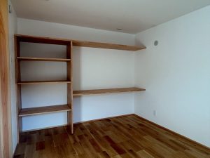 2階の子ども部屋にも、可動棚を使った収納と造作カウンターを設置。