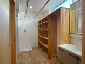 Hプランの水まわりでは、広々とした洗面脱衣室が特徴的です
