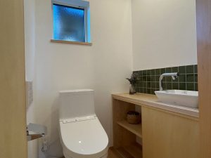深緑のタイルを採用し、和の落ち着きを感じる空間に仕上がっています。