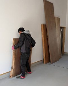 さまざまな一枚板が並び、木目や色合い、