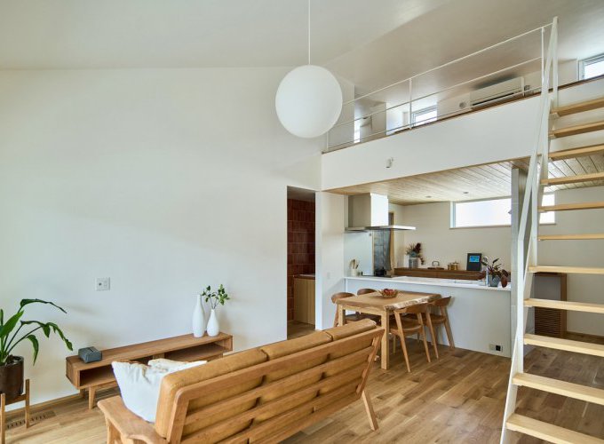 LDKは18畳の広々とした空間。クルミ材の床と天然木のインテリアが、ぬくもりある雰囲気を演出します。壁・天井には陰影の美しい漆喰を採用し、勾配天井とロフトスペースが空間に奥行きを与えます。ロフトのある1.5階設計により、暮らしに広がりと遊び心を添えています。