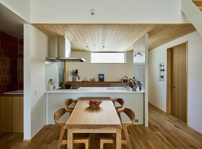 リビング全体を見渡せる対面式キッチンには、やわらかなライトグレーのタイルをアクセントに使用しました。使いやすさを重視したパントリーと、造作のカップボードも備え付けており、日々の料理や家事がスムーズにこなせる空間となっています。