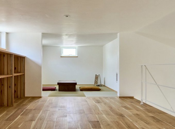 1.5階部分のロフトは、リビングと緩やかにつながり、視線と空間の広がりを生み出します。子どもの遊び場や収納スペースとして多用途に使え、落ち着きのある和室がロフトの一角に設けられているのも魅力です。天井が低めなので、包まれるような安心感が生まれます。