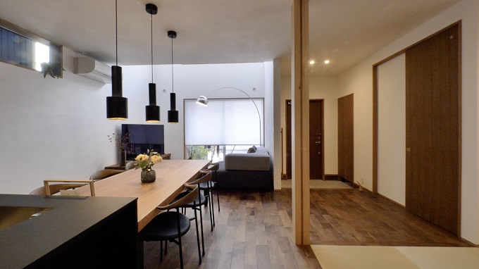 インテリアは北欧のデザイナーズで揃え、キッチンは黒基調のスタイリッシュなアイランドキッチンになっております。LDKに隣接した畳スペースで和と北欧スタイルを融合させた雰囲気です。間接照明で落ち着きのある2階のセカンドリビングは、本を読んだり、ワインを飲んだりする事の出来るゆとりのある空間となりました。子育て後のセカンドライフを愉しむHEAT20G3クラス・断熱等級7の高性能で高品質な住まいで快適性も妥協しません。