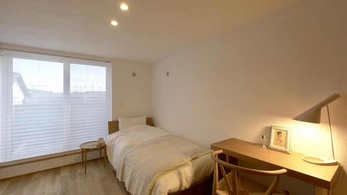 オリジナルで製作したベッド・カウンター・収納棚で、落ち着いた統一感ある空間。寝室の向こう側にはウォークインクローゼット。服やカバンなどをたっぷり収納できる空間もあり、散らかることなく、すっきりとした住まいを保ち続けられます。 -