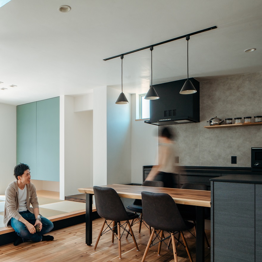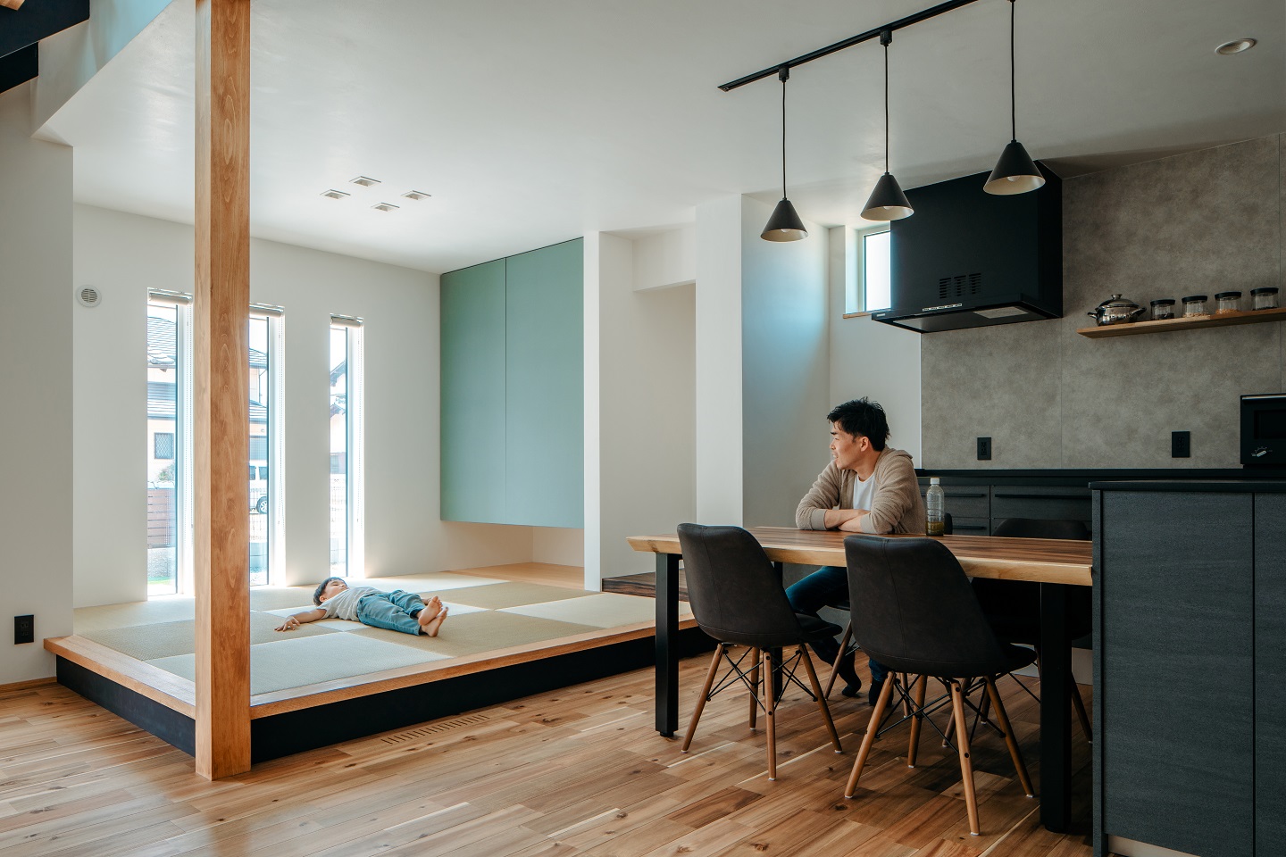 洋室のモダンな雰囲気に合わせた、正方形で縁のない琉球畳を用いた小上がりは、縦に長い窓を3つ配置することで光を確保し、ゆっくりと落ち着ける空間を作り出しています。琉球畳は比較的丈夫なため、キッズスペースとして利用することもできます。