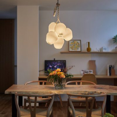 吹き抜けから差し込む自然光が空間を満たし、花束のようなペンダントライトがやわらかな光を投影しています。