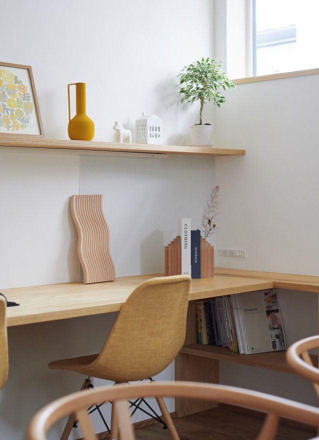 無垢の木で造作されたワーキングスペースは、ダイニング横に広がり、家族が一緒に過ごす空間として活用できます。