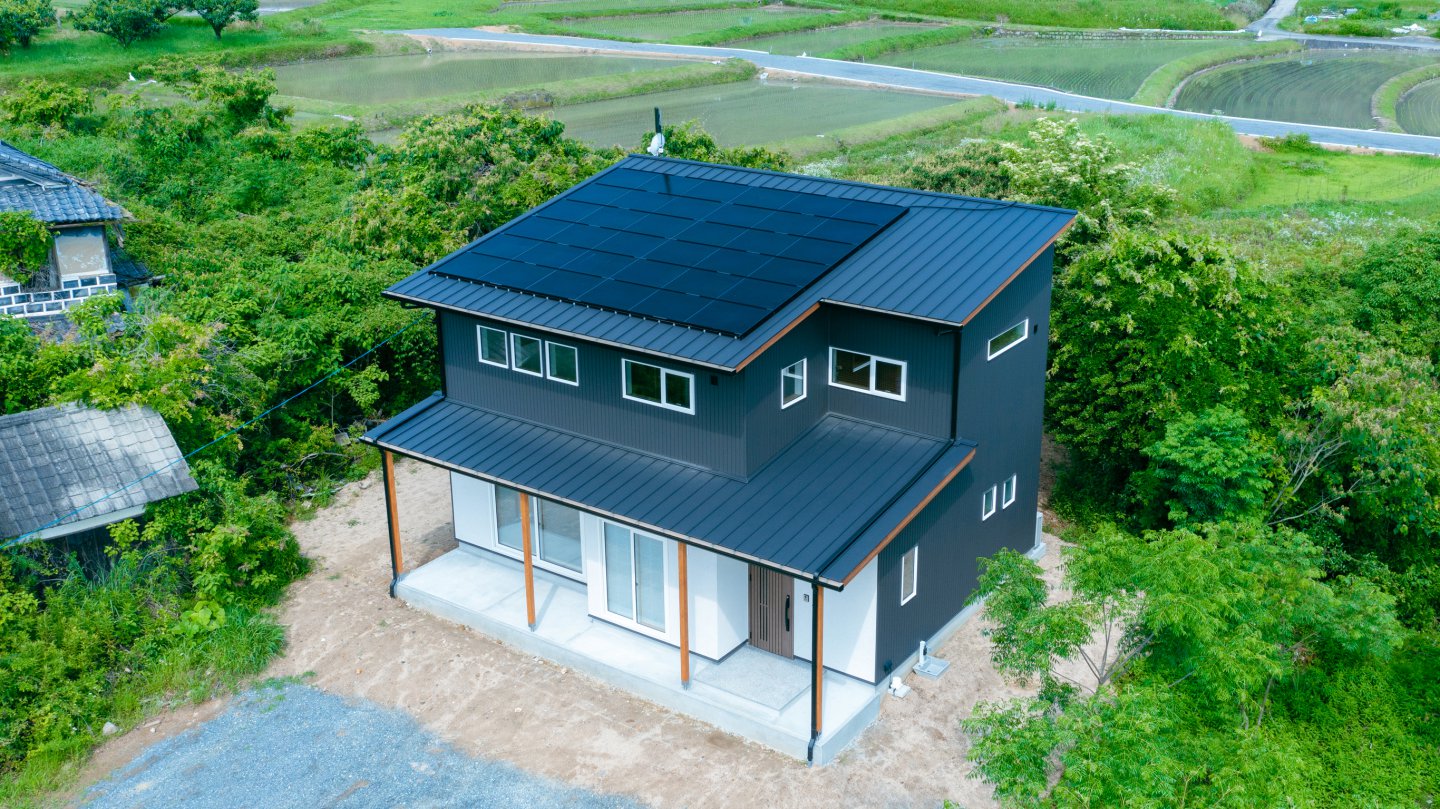 ツートンカラーが洗練された雰囲気を演出し、太陽光パネルを屋根に設置することで省エネルギー性も向上。