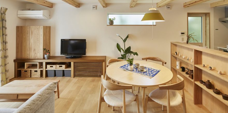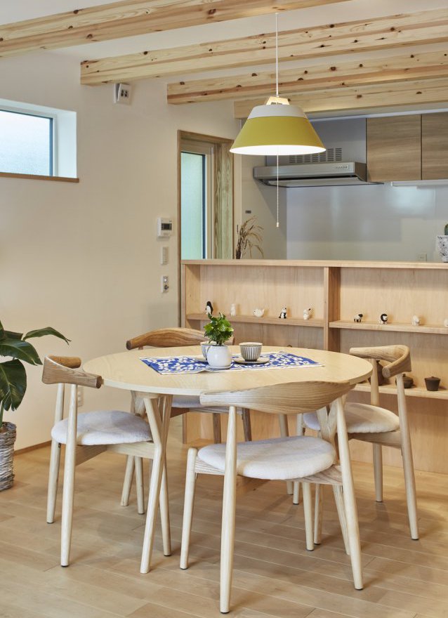 そこにはお気に入りの可愛らしい雑貨を並べることができる大工お手製のキッチンカウンターがあり、家族と共に過ごす時間がより豊かなものになります。