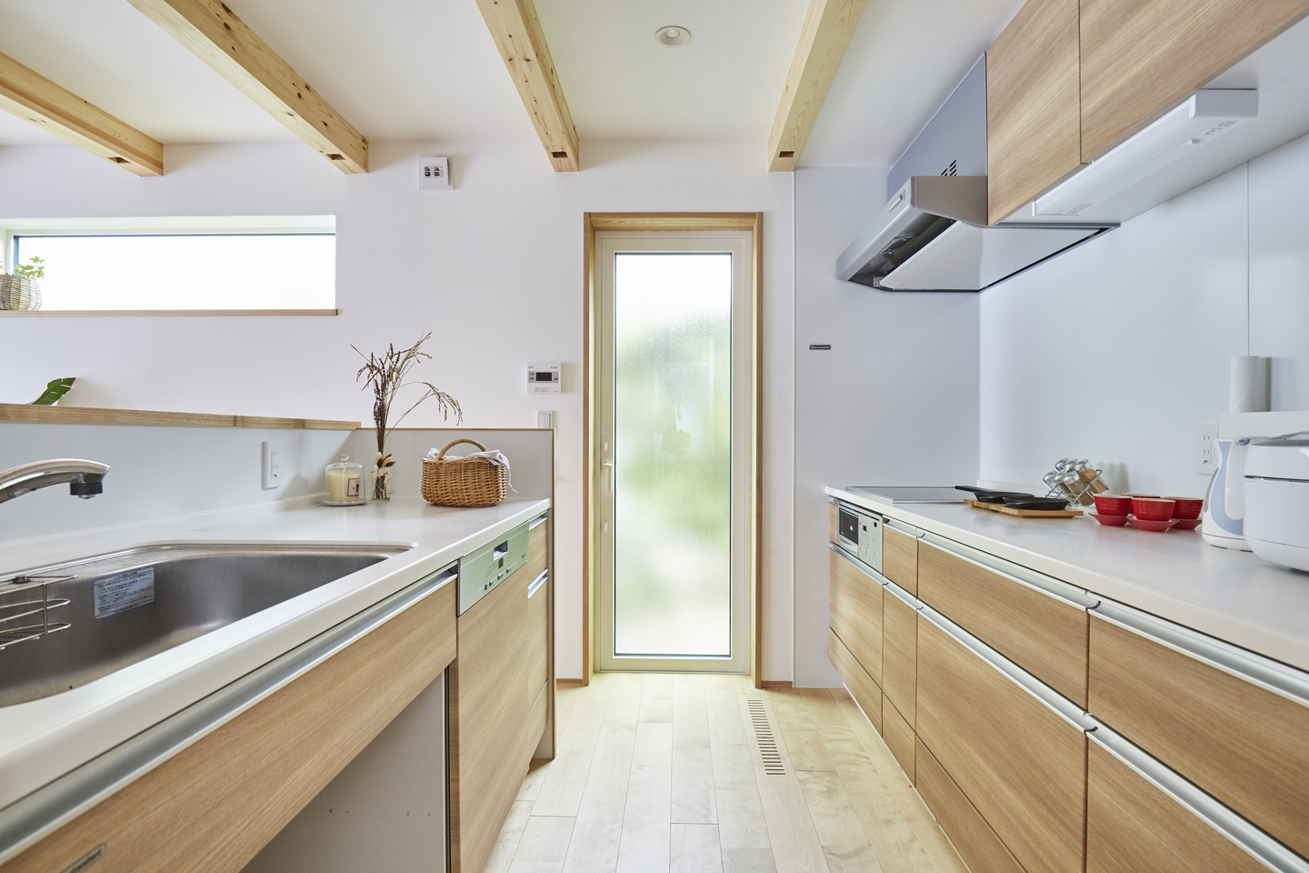 清潔感あふれるキッチンは、淡い色合いの木が優しく彩ります。