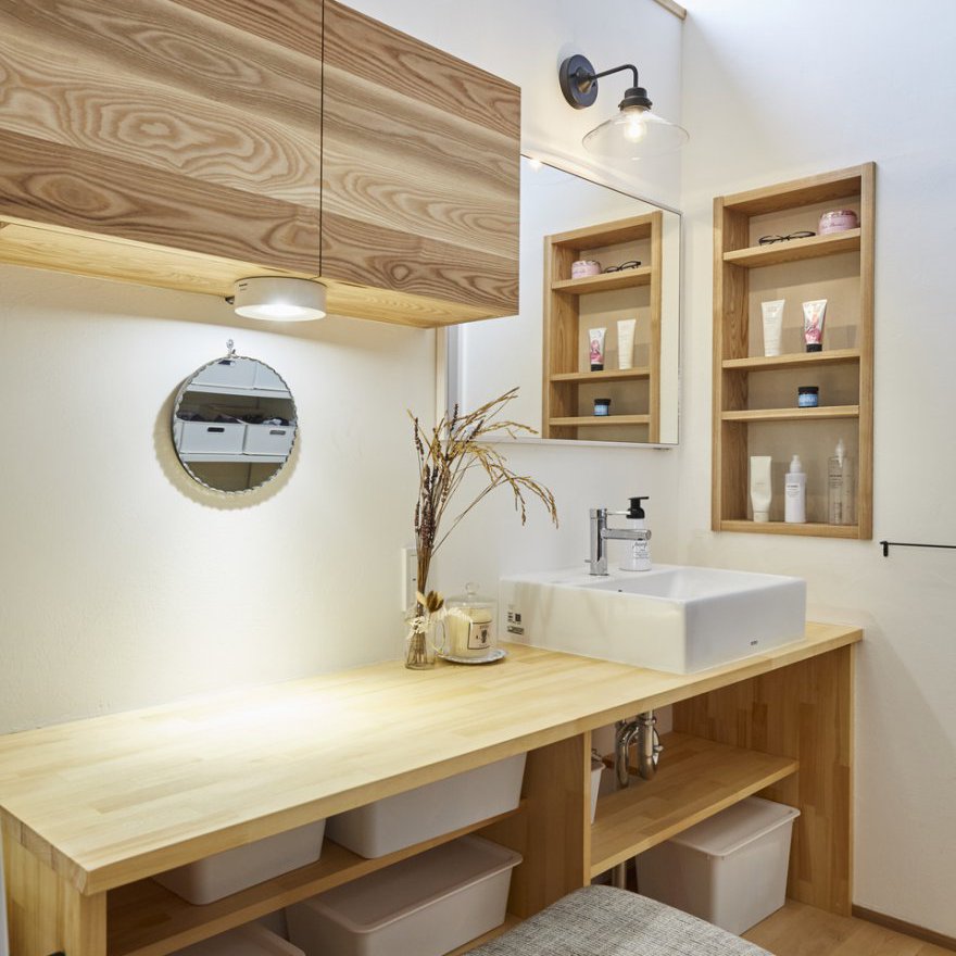 大工造作の洗面台は、木の温もりが心地よい朝のひとときを演出します。