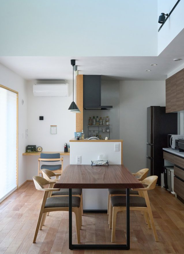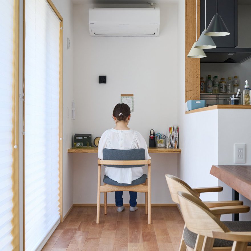 ダイニング横には奥様専用のワークスペースを設け、テーブルカウンターを本物の木で造作し、自然の風合いを楽しみながら作業に集中できる設計です。