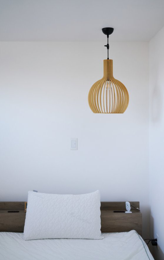ベッドルームは、愛らしい形の照明が漆喰壁に柔らかな影を落とし、落ち着いた雰囲気を醸し出しています。