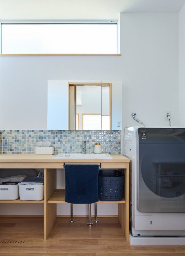 洗面台には爽やかな青色のタイルを張り、大工が造作で仕上げた唯一無二の洗面台を実現。