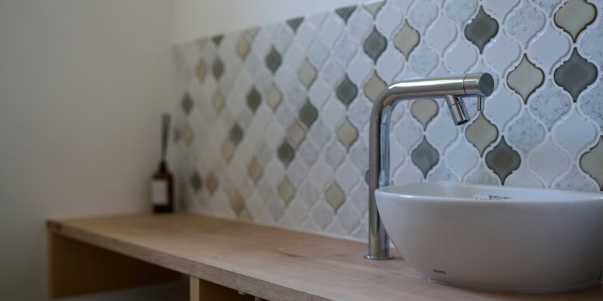 トイレにはアースカラーのおしゃれなタイルを張り、小さな洗面ボウルや無垢の造作だなと合うデザインに仕上げました。