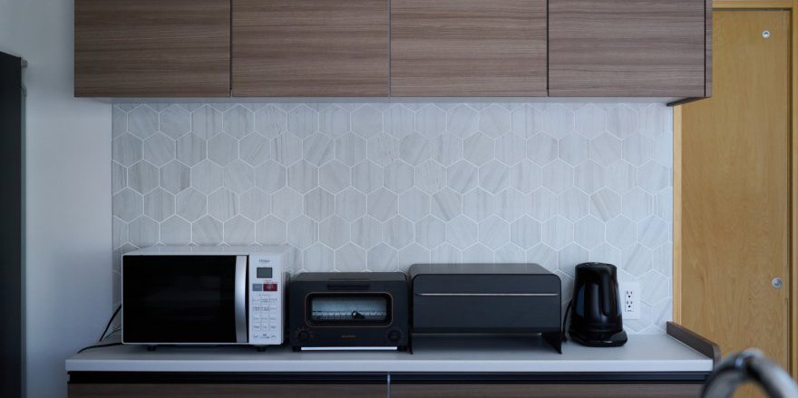 キッチンのバック棚にもタイルを張り、油汚れや水はねを防ぐと同時に、おしゃれな空間を演出しています。 -