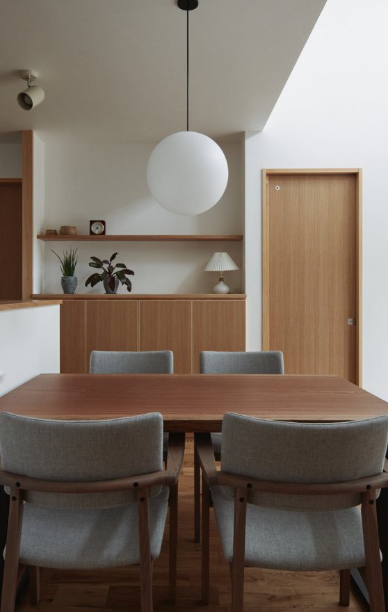 銘木をふんだんに使用した造作家具や、一枚板のダイニングテーブルが存在感を放ちます。