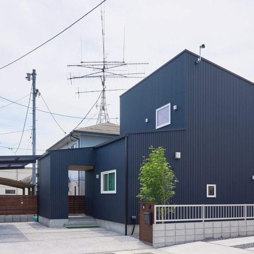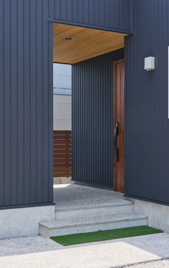 外観は黒のガルバリウム鋼板の外壁に、板張りの軒天やホワイトのサッシがアクセントを加えたモノトーンでスタイリッシュなデザインです。