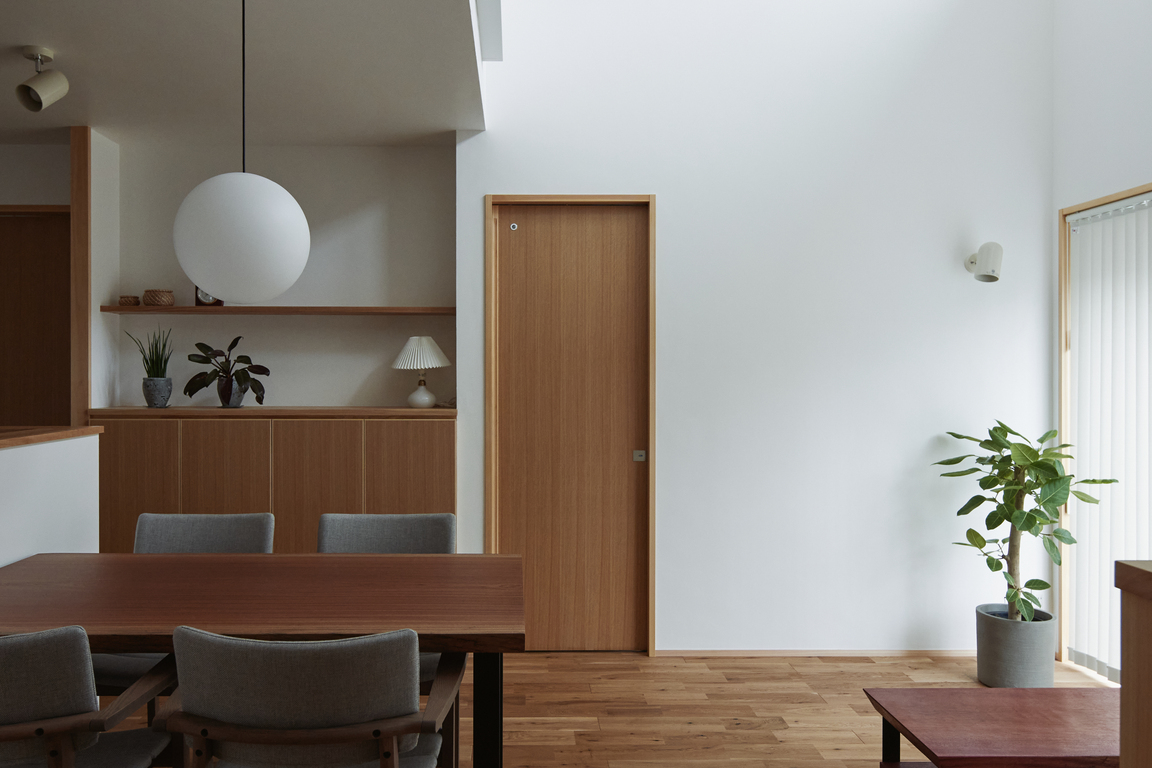 無垢の床は足触りがよく、漆喰壁は吹き抜けから差し込む陽の光を柔らかく広げ、心地よい明るさを保ちます。