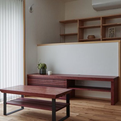 特にパープルハートのローテーブルとテレビボードは鮮やかな紫で、時間と共に深みのあるブラウンへと変化していく経年美化が楽しみです。