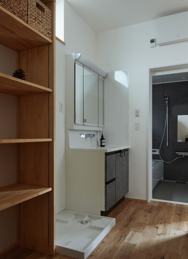 洗面回りは回遊性があり、階段下スペースを有効活用したパントリーは、収納力も抜群。
