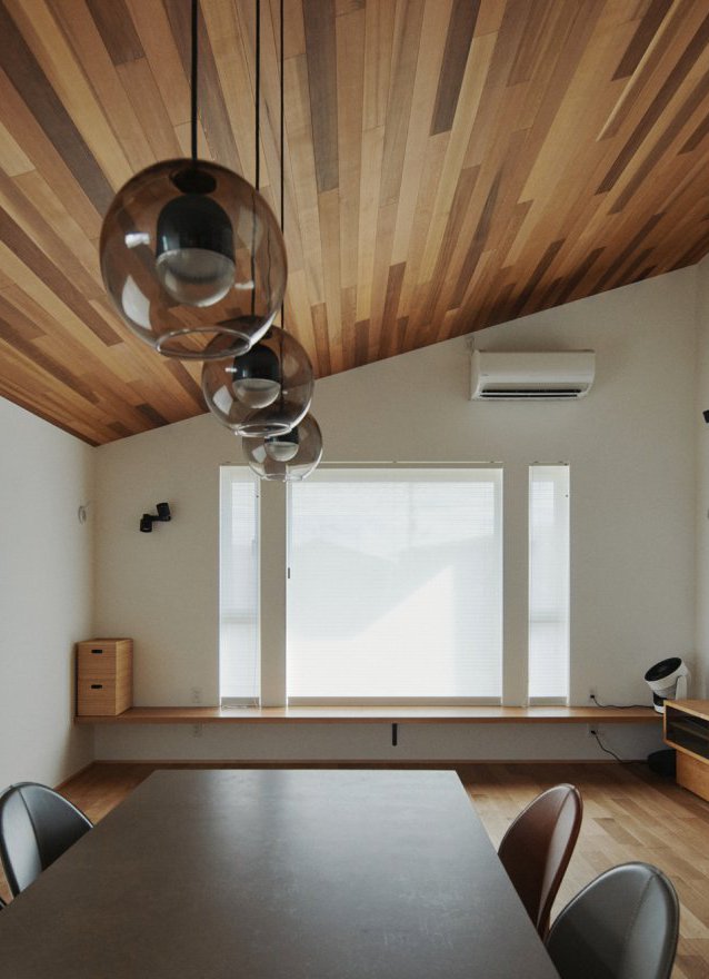この家のリビングは2階にあり、勾配天井に張られたレッドシダーが印象的です。