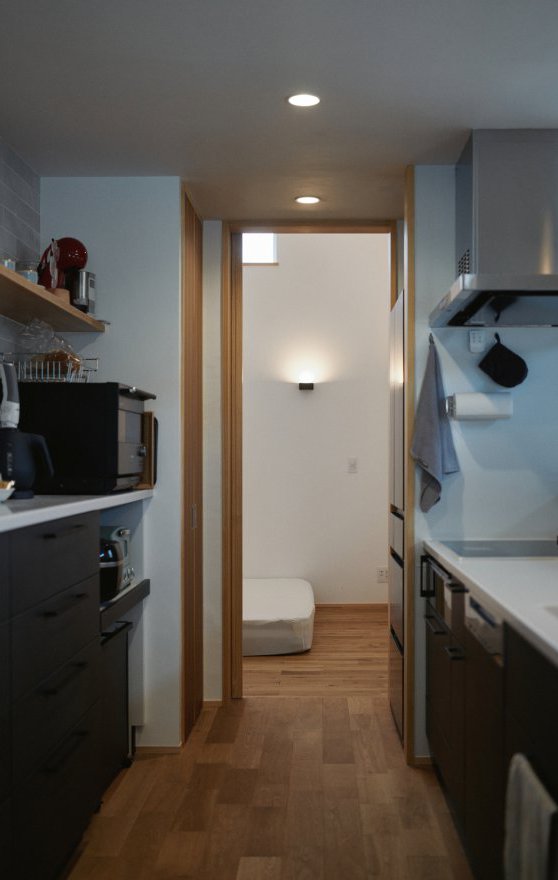 キッチン横の寝室で、朝のルーティンがスムーズに