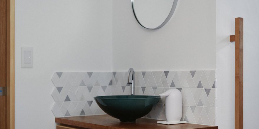 ホワイトのタイルは、漆喰の壁との調和が取れ、美しい空間を作り出しています。