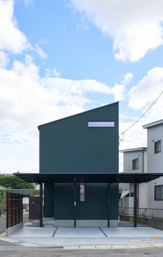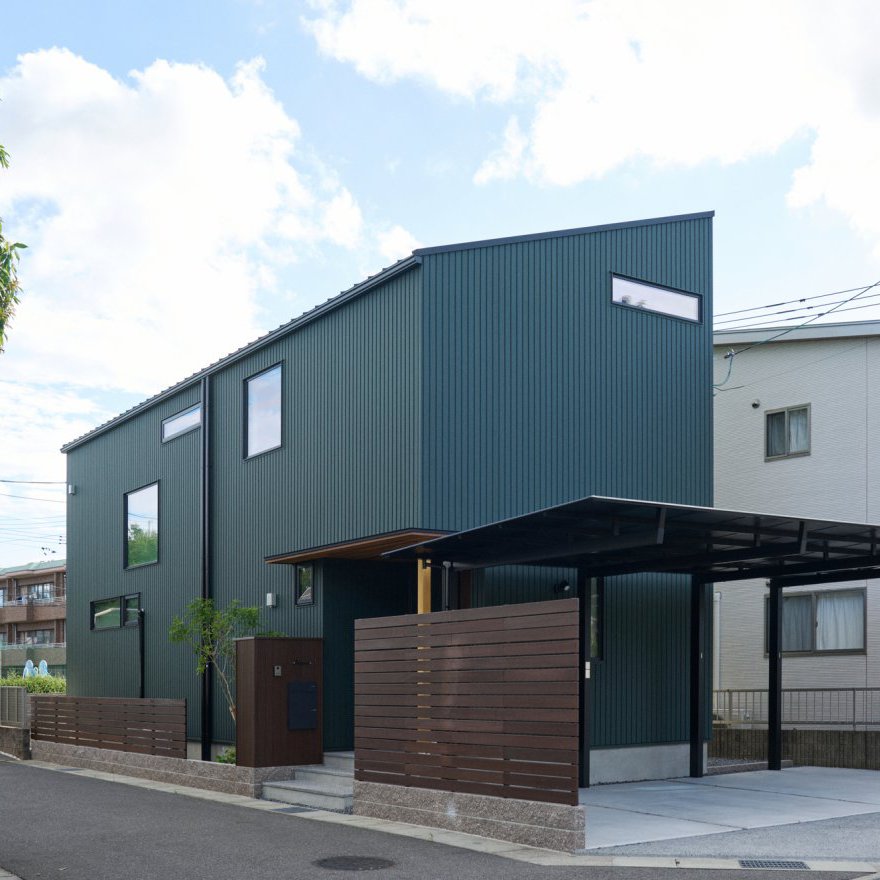 外壁にはモスグリーンのガルバリウム鋼板が使われており、周囲の風景と調和する優しい色合いが特徴です。