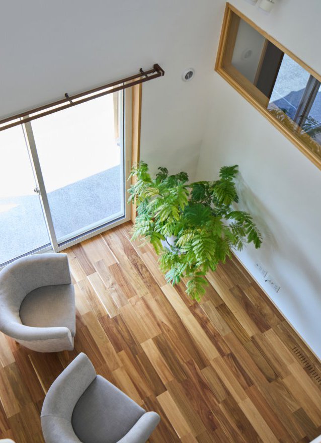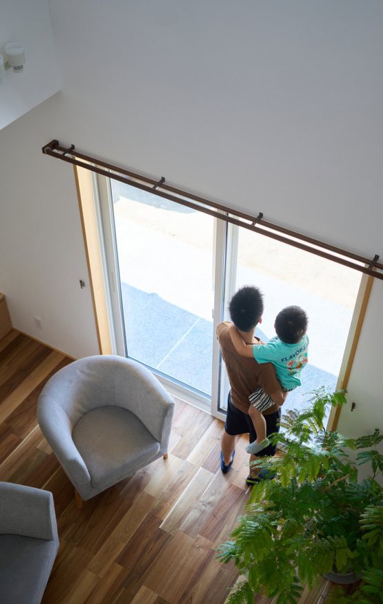 また、リビング上には吹き抜けを設けて、一階の掃き出し窓と二階の窓からしっかりと光を取り入れられるようにしました。