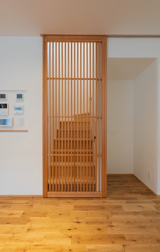 階段の入口に格子戸をつけたり、2階に猫のための部屋をつくりました。猫の部屋には爪対策で腰高まで板張りを施しています。