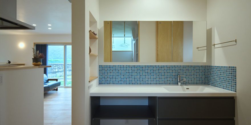 洗面台はタイルの色味にこだわって、水色を選びました。広くスペースを取って、二人並んでも三人並んでも余裕があります。 -